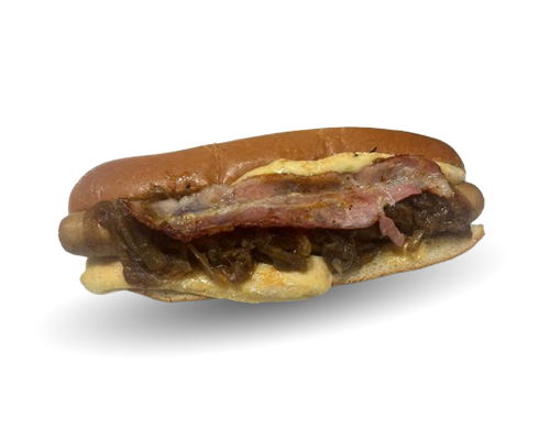 Pain Brioché, Saucisse, Maroille, Bacon, Oignon caramélisé, sauce bacon